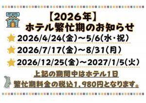 2026年ホテル繁忙期期間のお知らせです。