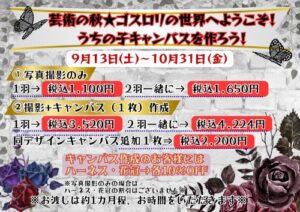 イベント情報皆さまこんにちは!『芸術の秋★ゴスロリの世界へようこそ!うちの子キャンバスを作ろう!』を開催いたします!全店ゴシックなイメージで作成された撮影ブースをご用意いたします♪今までにないデザインの背景となっており、イメージとしては「ゴスロリ」を意...