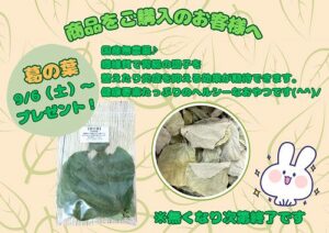イベントお知らせ※全店舗よりお届けします※皆様こんにちは!商品をご購入のお客様へ9/6(土)~『葛の葉』をプレゼントいたします。葛の葉は繊維質で胃腸の調子を整えたり炎症を抑える効果が期待できます。健康要素たっぷりのヘルシーなおやつです(^^)/国産無農薬♪...