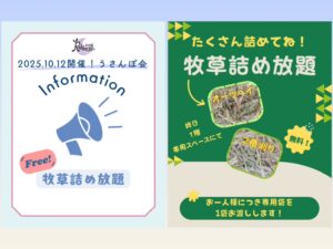 イベントお知らせイベント情報~牧草詰め放題のご案内~ ご参加の皆様へ2025年10月12日(日)開催の「 Rabbit-Ruru うさんぽ会~和幸カントリー倶楽部~」では、牧草詰め放題にご参加いただけます! 開催時間:終日場所:1階専用スペース ★ご参加おひとり様につ...
