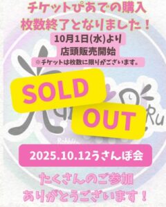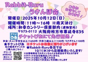 イベントお知らせイベント情報2025年10月12日(日)開催「Rabbit‑Ruru うさんぽ会 ~和幸カントリー倶楽部~」チケット販売についてのお知らせこの度は「うさんぽ会」に多くのお申込みをいただき、誠にありがとうございます。以下、現在のチケット販売状況およびご注...
