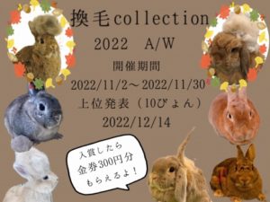 イベントお知らせイベント情報皆様こんばんは!!11月に行われた換毛Collection♪沢山のうさぎさん達にご参加いただきました!ご参加頂いた皆様ありがとうございました!!明日12/14(水)上位10ぴょんを発表いたしますヾ(≧▽≦)ノ各店、ブログ・インスタグラムにて...