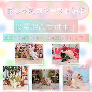 ※全店舗よりお届けします※2月にエントリーが行われてた≪おしゃれコンテスト2025≫の投票がいよいよ始まります!詳細は以下の通りです♪【投票期間】2025年3月7日(金)~3月23日(日)【投票方法】2月にエントリーしてくださったうさぎさん...