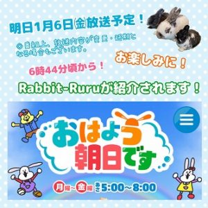 皆様こんばんは!突然ですが明日、1月6日(金)朝日放送テレビ【おはよう朝日です】の聞いてほしい!ホッとなニュースのコーナーにてラビットルルが紹介される予定です☆彡6時44分頃より放送予定となっております!※番組上、放送内容が変更、延期になる...