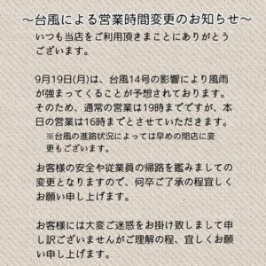 ※全店舗よりお届けします※ いつも当店をご利用頂きまことにありがとうございます。 9月19日(月)は、台風14号の影響により風雨が強まってくることが予想されております。 そのため、通常の営業は19時までですが、本日の営業は16時までとさせて...
