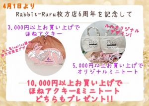 皆様こんにちは!Rabbit-Ruru枚方店は4月2日をもちまして6周年を迎えることとなりましたヾ(≧▽≦)ノ日頃より皆様に支えて頂き、無事に6周年を迎えれる事スタッフ一同、感謝しております!!感謝の気持ちを込めまして4月1日より・3,00...