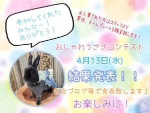 皆様こんばんは!!3月に投票が行われた《おしゃれうさぎコンテスト2022》の結果発表がついに明日発表されますご参加いただいたうさぎさん、投票をして下さった皆様ありがとうございます!!投票結果は、各店ブログ等にて発表いたしますのでお楽しみに!...