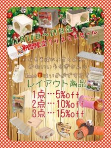 皆様こんにちはとってもお得なクリスマスセールを明日12/10(木)~29(火)まで開催致します!対象の商品は、レイアウト商品になっております1点で5%off・2点で10%off・3点で15%offとなりますかわいいうさぎさんにもクリスマスプ...