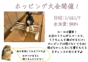 六甲道店限定で、2月6日(土)&7日(日)にホッピング大会を開催する事となりました(^^♪飛べても飛べなくても賞を狙えるので皆様、是非ご参加ください(*^^*)参加費:無料ルール:10分間お店のうさんぽスペースで遊んでもらうだけ!!皆様のご...